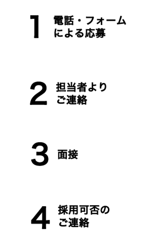 | 選考について | 「応募フォーム」よりお送りいただいた内容をもとに書類選考を行います。 書類選考通過後は本社にて面接を行います。人物重視の採用です! ※面接時に履歴書(写真貼付)・職務経歴書をお持ちください。 |